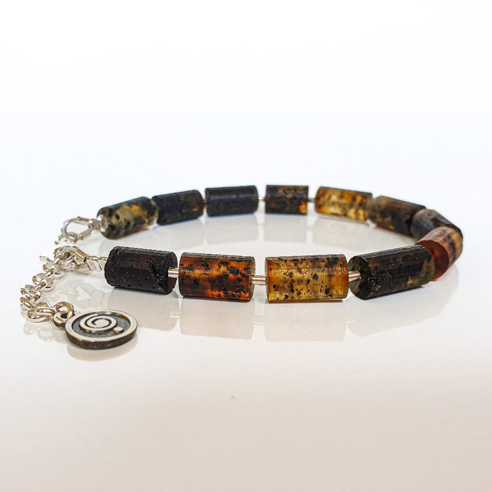 Bracelet for women with natural amber and silver 925. It has an accent handcrafted silver 925 medallion with sign of Spiral representing prosperity and growth.