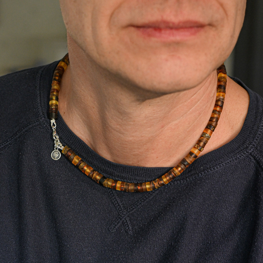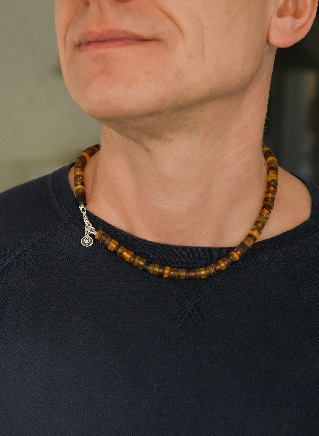 Necklace for men with natural Baltic amber and silver 925. Amber diameter is 6.5 mm. Amber beads are strapped on strong, long lasting cord, all details are silver 925. Jewelry is lovingly packaged in a gift box and comes with a list of amber qualities. In photo model wear necklace with length of 47 cm. Model is 184 cm.