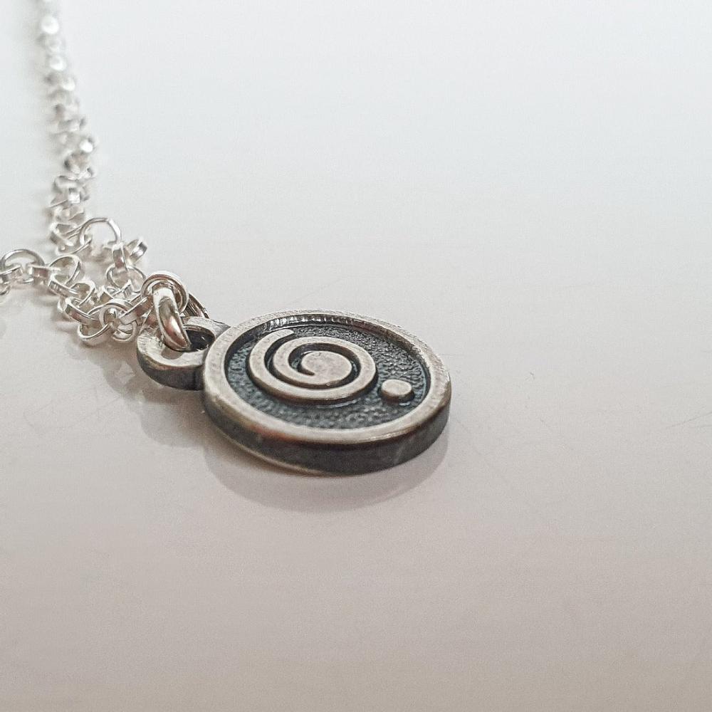 The stone is set in silver 925. Chain length is 60 cm. The jewelry is decorated with a handmade silver medallion with a spiral symbolizing growth and prosperity.