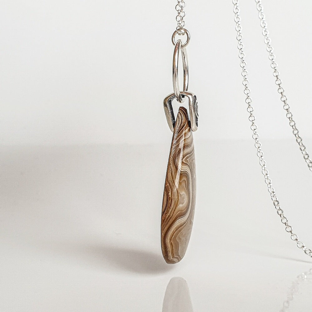 Akmuo įstatytas į autorinį juvelyrų rankų darbo sidabro pakabutį su spirale - asmenybės augimo ir klestėjimo simboliu.